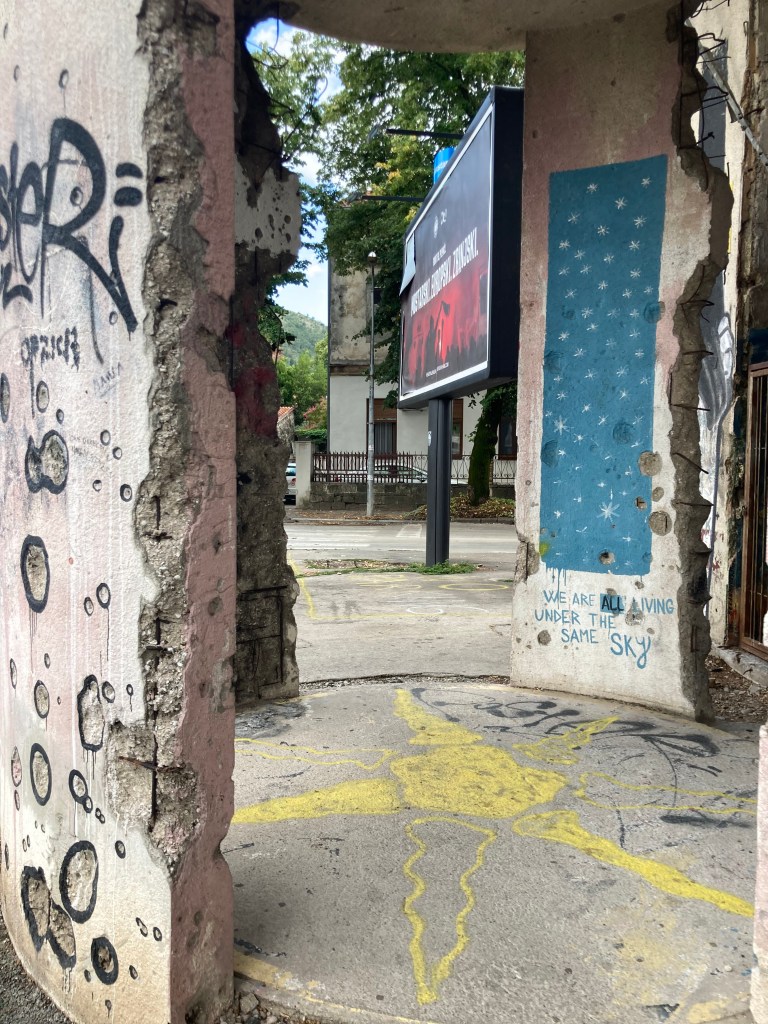 Where will this impulse to forget, whether it comes from the people or the state, leave places like the sniper tower? Perhaps it’ll be boarded up again for another decade; perhaps it’ll be demolished; perhaps one day, the history will be put to one side, and it’ll be renovated into upmarket flats, like Berlin Prenzlauer Berg’s Wasserturm, which contained an early concentration camp in 1933. The tower stays in my mind as I first saw it, with my little brother playing in the concrete skeleton of what was once a glass revolving door. All that’s left is a cylindrical structure jutting out onto the street corner: four panels of concrete and four gaps. On three of the panels, a pale blue starry night is painted, with the same phrase written underneath in English, German and a third language. Google Translate tells us it is Bosnian, but an alternative, perhaps more accurate name is BCMS: Bosnian-Croatian-Montenegrin-Serbian. All of these are one language, divided up to fit today’s national borders. I picture my little brother weaving between them, unaware of what this place has meant and may go on to mean. And I imagine myself, doubtful and curious, standing under its odd canopy, reading the same words in each language: WE ARE ALL LIVING UNDER THE SAME SKY.