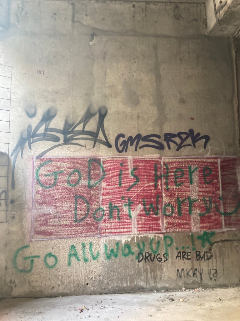 Slowly, we begin to head upwards. I hadn’t expected the overwhelming openness. Forget bannisters, railings, or anything else to hold onto. These stairs don’t even have walls. It’s a risk assessor’s nightmare, but there’s something liberating about the false sense of dizziness induced by the sweeping skyline. It’s safe enough, so long as you’re sensible and avoid the edges. I feel like a child riding a bike without stabilisers. But I can’t get too comfortable, because even if there’s no danger now, the awareness of past threat hangs over me. So much of this art is haunting; the mural of shifting faces which spans a corner, warping outwards, and the sly, subtle warning to avoid the exposed lift shafts where someone has spraypainted two arrows, one pointing upwards and one downwards, respectively labelled ‘HEAVEN’ and ‘HELL’. The fall would be fatal. It’s a privilege, of course, to wander through this place in a time of relative safety. I find myself longing to know when exactly each piece of graffiti was done, to help put a context to this strange balance of beauty and of sinister reminders.