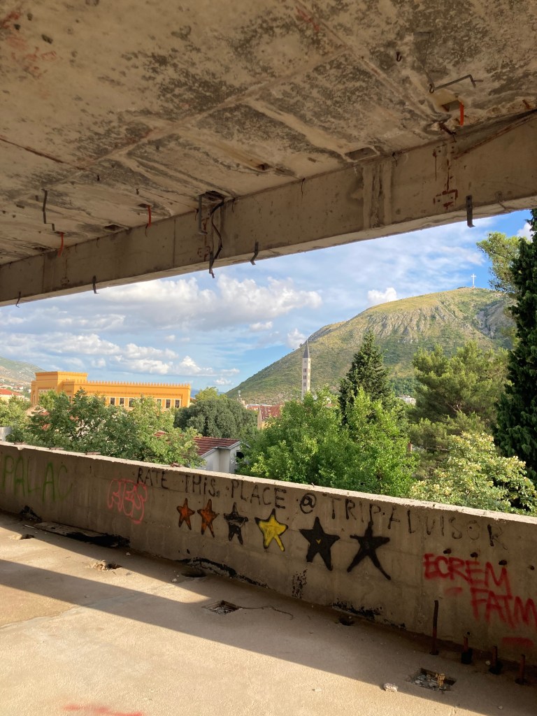 From the highest floor, we look down and see my mother and my youngest brother below us in the park, playing on the bridges over the water. Snipers once took aim from the top of this building, and here I am, waving at the tiny forms of the people I love most in the world. Maybe it’s the greenness of the water, or the beautiful mosques and churches tucked behind every street corner, but Mostar feels like a peaceful place today. From this vantage point, I wonder how much of that peace is the sort that survives on silence, or at least relative quietude. The worst traces of the war have been cleared out of sight, but the bruises remain, and if you stray too far from the centre, you find places like this, where the legacy of the war still throws a long shadow. I find many things in this strange tower on the city’s edge, but peace and quiet isn’t one of them. It feels busy, loud with all the voices it contains. It echoes with the laughter and disagreement of artists, teenagers, soldiers and ghosts.
